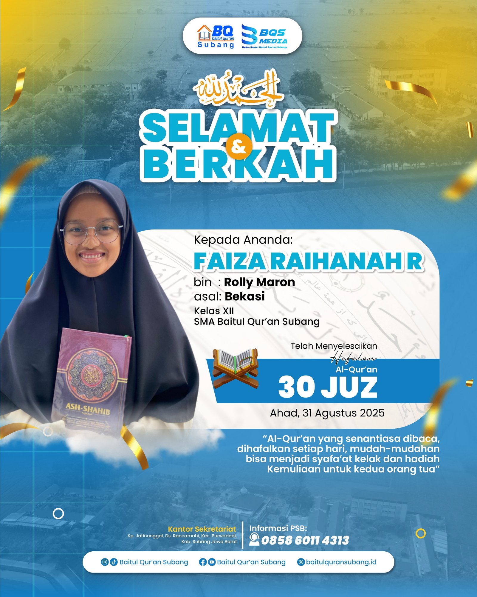 Alhamdulillah bersyukur bisa sampai sejauh ini. Terimakasih untuk asatidz Baitul Qur’an Subang yang selalu memberi motivasi terbaiknya.